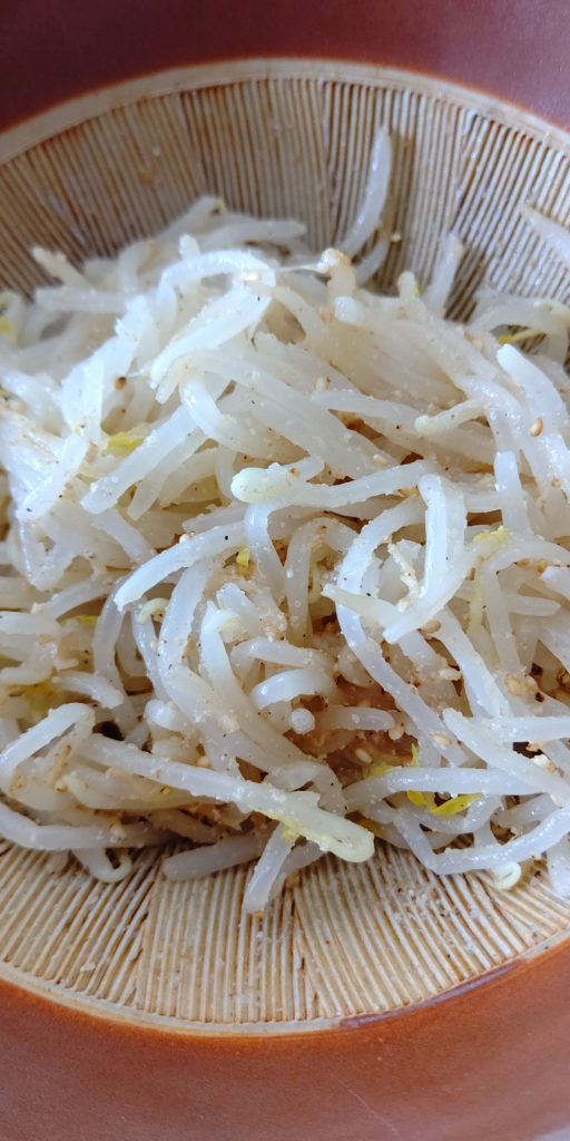 余ったすし酢が賞味期限切れを迎えようとしているので、「何とかしないと・・・」と思い、もやしで胡麻和えを作ってみました!